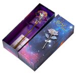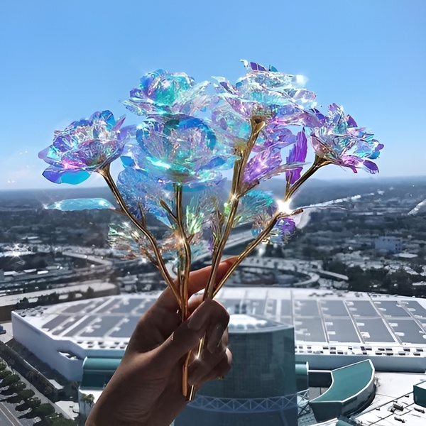 Kiekviena rožė pagaminta su vaivorykštiniu, holografiniu padengimu, kuris nuostabiai spindi šviesoje, sukurdamas galaktiką primenantį spindesį, kuris tiesiog užburia.